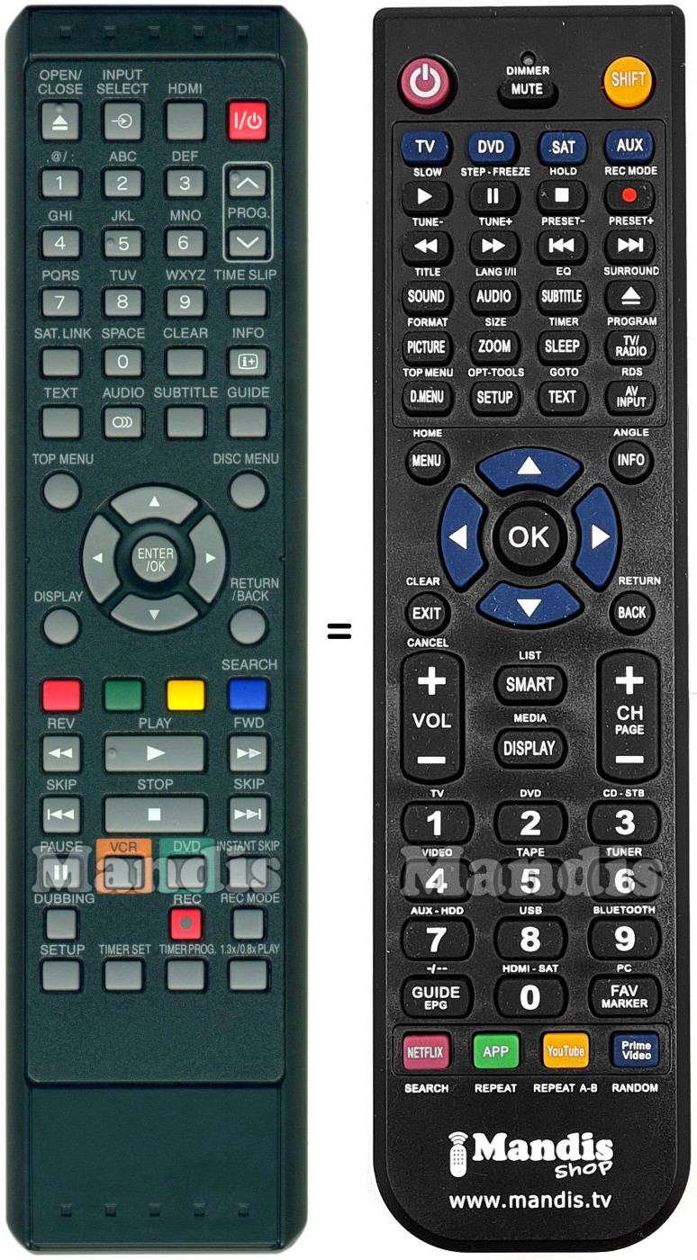 Abaixo, mostraremos a correspondência entre cada botão no controle remoto original e o botão que executa a mesma função no controle remoto de substituição. Em alguns casos, pode ser necessário pressionar a tecla SHIFT antes de pressionar outro botão para realizar determinadas ações. Essas funções adicionais geralmente não são amplamente utilizadas e são incluídas para facilitar o entendimento do controle remoto de substituição, ou porque o controle remoto original tem mais botões do que seu equivalente.
