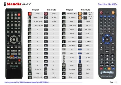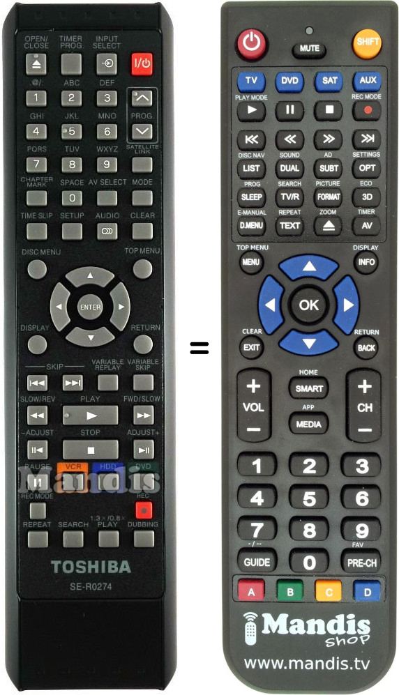 Este controle remoto executa todas as funções do controle remoto original: Power, Open / Close, Timer Prog, Input Select, 1, 2, 3, 4, 5, 6, 7, 8, 9, 0, Chapter Mark, AV Select, Prog +, Prog -, Satellite Link, Mode, Time Slip, Setup, Audio, Clear, Disc Menu, Top Menu, Up, Down, Right, Left, Enter, Display, Return, Skip I<<, Skip >>I, Variable Replay, Variable Skip, << / Slow Rev, Play, >> / Slow Fwd, Play Reverse / Adjust -, Stop, Play / Adjust +, Pause, VCR, HDD, DVD, Rec Mode, Rec, Repeat, Search, 1.3x / 0.8x Play, Dubbing
