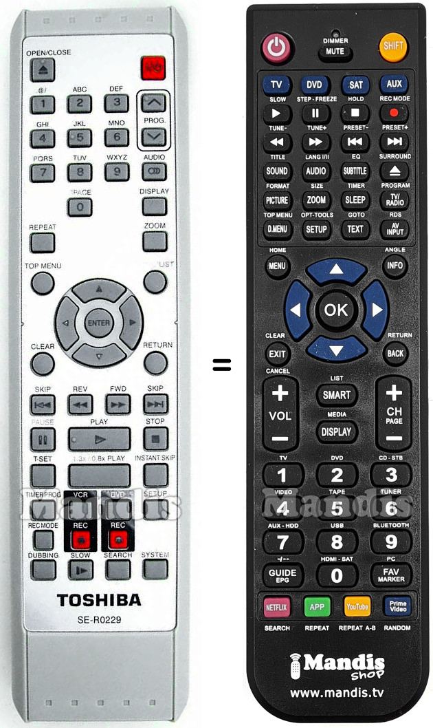 Abaixo, mostraremos a correspondência entre cada botão no controle remoto original e o botão que executa a mesma função no controle remoto de substituição. Em alguns casos, pode ser necessário pressionar a tecla SHIFT antes de pressionar outro botão para realizar determinadas ações. Essas funções adicionais geralmente não são amplamente utilizadas e são incluídas para facilitar o entendimento do controle remoto de substituição, ou porque o controle remoto original tem mais botões do que seu equivalente.