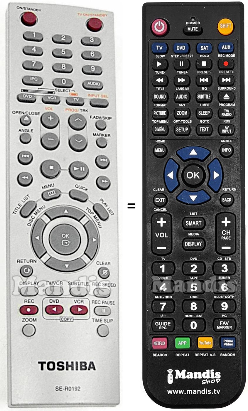 Este controle remoto executa todas as funções do controle remoto original: On/Standby, TV On/Standby, 1, 2, 3, 4, 5, 6, 7, 8, 9, 0, IPC, Audio, DVD, VCR, TV, Input Sel, Open / Close, Angle, Vol+, Vol-, Prog/Trk+, Prog/Trk-, F.Adv / Skip, Marker, I<<, >>I, <<, >>, Stop, Play/Pause, Title List / Disc Menu, Menu, Quick, Play List / Top Menu, Up, Left, OK, Right, Down, Return, Clear, Display, TV/VCR, Subtitle, Rec Speed, Rec, Copy DVD, Copy VCR, Rec Pause, Zoom, Time Slip