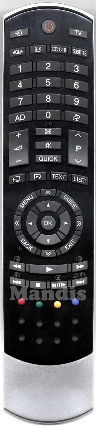 POWER, SOURCE, TV, -[/]-, [<>], O)I/II, Subtitle, 1, 2, 3, 4, 5, 6, 7, 8, 9, 0, AD, RECALL, [i+], MUTE, QUICK, VOL+, VOL-, P+, P-, [. ], [>], TEXT, LIST, OK, UP, DOWN, RIGHT, LEFT, ↑↑, ↓↓, >>, <<, GUIDE, MENU, EXIT, BACK, <<, >>, PLAY, I<<, STOP, PAUSE/STEP, >>I, RED, GREEN, YELLOW, BLUE