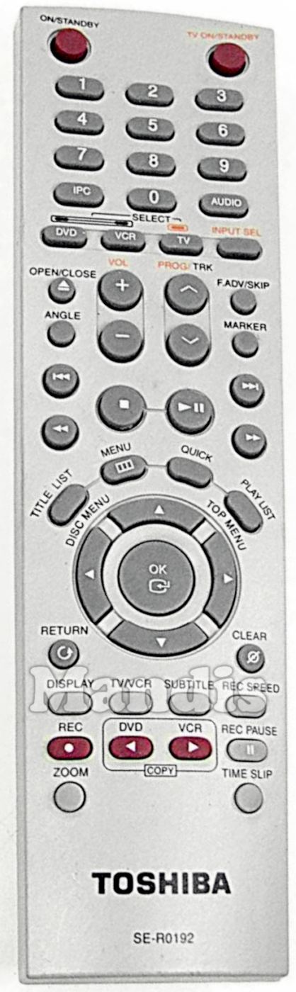 On/Standby, TV On/Standby, 1, 2, 3, 4, 5, 6, 7, 8, 9, 0, IPC, Audio, DVD, VCR, TV, Input Sel, Open / Close, Angle, Vol+, Vol-, Prog/Trk+, Prog/Trk-, F.Adv / Skip, Marker, I<<, >>I, <<, >>, Stop, Play/Pause, Title List / Disc Menu, Menu, Quick, Play List / Top Menu, Up, Left, OK, Right, Down, Return, Clear, Display, TV/VCR, Subtitle, Rec Speed, Rec, Copy DVD, Copy VCR, Rec Pause, Zoom, Time Slip