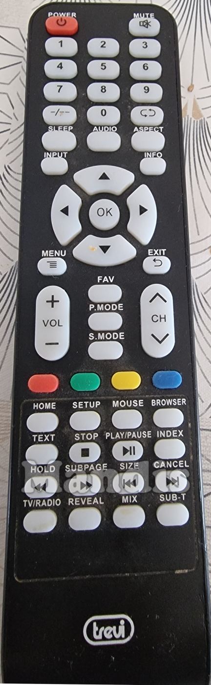 Power, Mute, 1, 2, 3, 4, 5, 6, 7, 8, 9, 0, -/--, Recall, Audio, Sleep, Aspect, Input, Info, Exit, Menu, FAV, P.Mode, S.Mode, Vol+, Vol-, CH+, CH-, Up, Down, Right, Left, OK, Red, Green, Yellow, Blue, Home, Setup, Mouse, Browser, Text, Stop, Play/Pause, Index, >>I/Cancel, I<</Size, <</Hold, >>/Subpage, Reveal, Tv/Radio, Mix, Sub-T