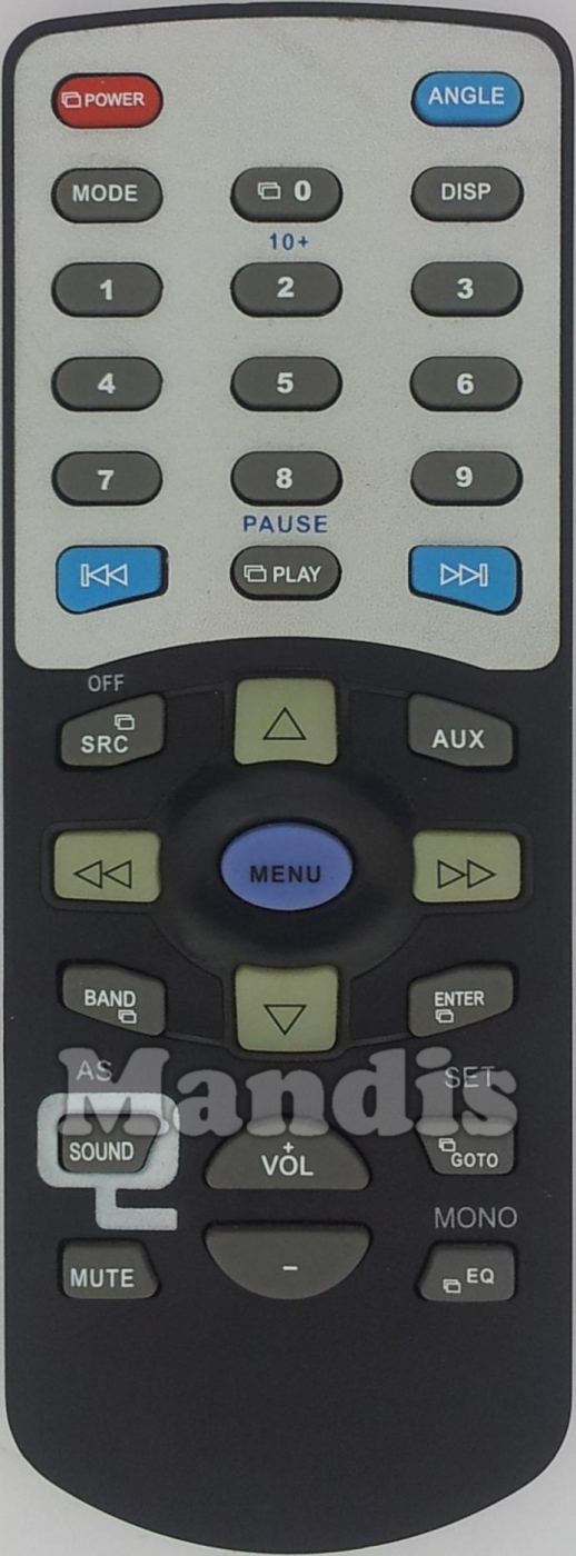 Power, Angle, Mode, 0, DISP, 1, 2, 3, 4, 5, 6, 7, 8, 9, Play/Pause, I<<, >>I, SRC/Off, AUX, Up, Down, <<, >>, Menu, Band, Enter, Sound/AS, GOTO/SET, Mute, EQ/Mono, Vol+, Vol-