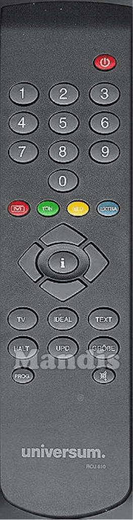 Power, 1, 2, 3, 4, 5, 6, 7, 8, 9, 0, Red / M, Green, Yellow, Blue / Extra, Up, Left, OK / i, Right, Down, TV, Ideal, Text, Halt, UPD, Grobe, Prog, Mute