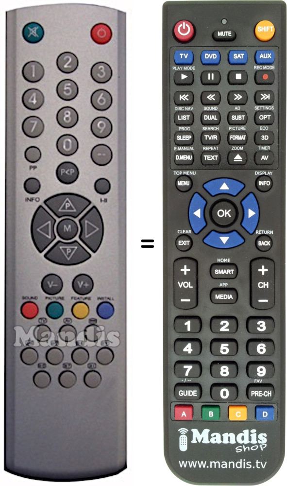 Este controle remoto executa todas as funções do controle remoto original: Power, Mute, 1, 2, 3, 4, 5, 6, 7, 8, 9, 0, PP, --, P<P, Info, I-II, Up / P+, Down / P-, Right, Left, M, V-, V+, Red / Sound, Green / Picture, Yellow / Feature, Blue / Install, TV, AV, [≡], [ /≡], [≡o], [≡+], [≡x], [≡♦], [≡?], [≡i]