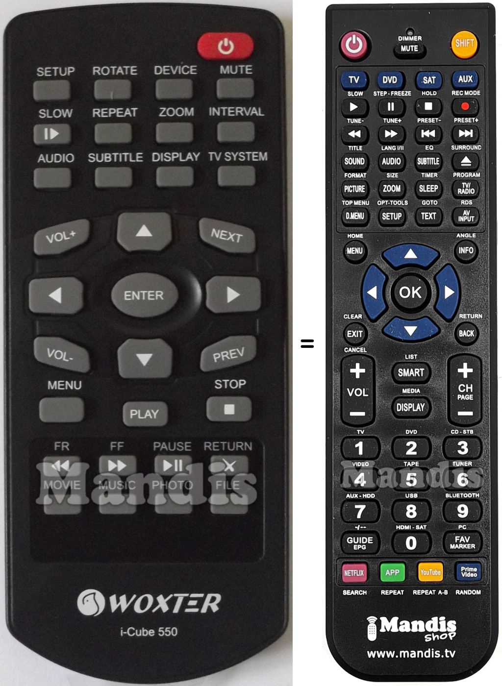 Abaixo, mostraremos a correspondência entre cada botão no controle remoto original e o botão que executa a mesma função no controle remoto de substituição. Em alguns casos, pode ser necessário pressionar a tecla SHIFT antes de pressionar outro botão para realizar determinadas ações. Essas funções adicionais geralmente não são amplamente utilizadas e são incluídas para facilitar o entendimento do controle remoto de substituição, ou porque o controle remoto original tem mais botões do que seu equivalente.