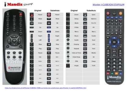 Este controle remoto executa todas as funções do controle remoto original: POWER, MUTE, SETUP, ZOOM, MODE, ANGLE, SUB-T, VIDEO, I<<, >>I, VOL+, <<, >>, VOL-, STOP, PLAY/PAUSE, MUSIC, MENU, ENTER, UP, DOWN, RIGHT, LEFT, DISPLAY, AUDIO, OTB, REPEAT, INTERVAL TIME, SLIDE SHOW