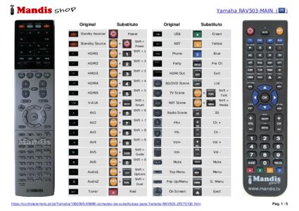 Este controle remoto executa todas as funções do controle remoto original: Standby Receiver, Standby Source, HDMI 1, HDMI 2, HDMI 3, HDMI 4, HDMI 5, V-AUX, AV 1, AV 2, AV 3, AV 4, AV 5, AV 6, Audio 1, Audio 2, Tuner, USB, NET, Phono, Party, HDMI OUT, BD/DVD Scene, TV Scene, NET Scene, Radio Scene, Program+, Program-, Vol+, Vol-, Mute, Top Menu, Pop Up/Menu, On screen, Option, Return, Display, Enter, Up, Down, Left, Right, Mode, Stop, Pause, Play/Band, << Tuning, Tuning >>, I<< Preset, Preset >>I, Movie, Music, Sur. Decode, Straight, Info, Sleep, Enhancer, Pure Direct, 1, 2, 3, 4, 5, 6, 7, 8, 9, 0, +10/Memory, ENT