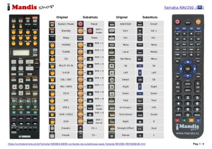 Este controle remoto executa todas as funções do controle remoto original: System Power, Standby, Power AV, Power TV, A, B, Input Mode, Sleep, PHONO, TUNER, CD, MULTI CH IN, V-AUX, CBL / SAT, MD / TAPE, CD-R, DTV, VCR 1, DVR / VCR2, DVD, TV Vol+, TV Vol-, Preset+ / CH+, Preset- / CH-, TV Input, TV Input / A/B/C/D/E, Vol+, Vol-, Mute, Level / Title, Set Menu / Menu, Up, Left, Enter, Right, Down, Test / Return, On Screen / Display, Pure Direct, Night / Audio, Stright Effect, Stereo / 1, Hall / 2, Jazz / 3, Rock / 4, Entertain / 5, Music / 6, TV Thtr / 7, Movie / 8, THX / 9, Standard / 0, +10, Extd Sur. / Ent., <<, >>, I<<, >>I, Rec / Disc Skip, Stop, Pause, Play