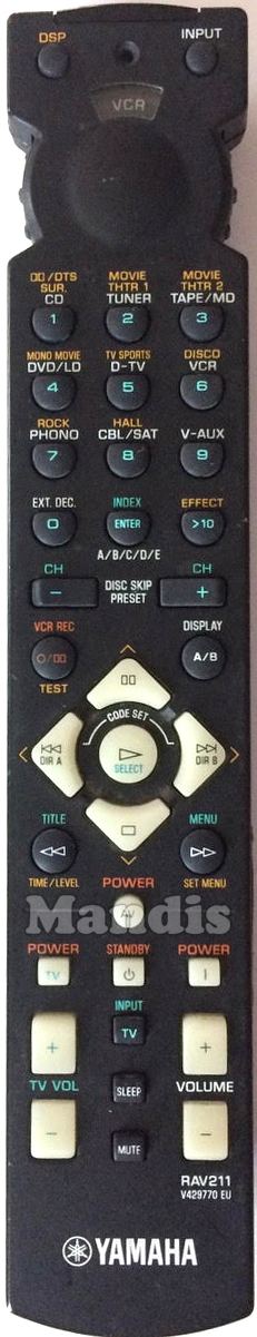 DSP, Input, 1 / CD / DD/DTS Sur., 2 / Tuner / Movie Thtr 1, 3 / TAPE/MD / Movie Thtr 2, 4 / DVD/LD / Mono Movie, 5 / D-TV / TV Sports, 6 / VCR / Disco, 7 / Phono / Rock, 8 / CBL/SAT / Hall, 9 / V-Aux, 0 / Ext. Dec., Enter / Index / A/B/C/D/E, >10 / Effect, Preset- / Disc Skip- / CH-, Preset+ / Disc Skip+ / CH+, Rec/pause / Test / VCR Rec, A/B / Display, Up / Pause, Down / Stop, Right / >>I / Dir B, Left / I<< / Dir A, Select / Play, << / Title / Time/Level, >> / Set Menu / Menu, AV Power, Power, Standby, TV Power, TV Vol+, TV Vol-, TV Input, Sleep, Mute, Volume+, Volume-