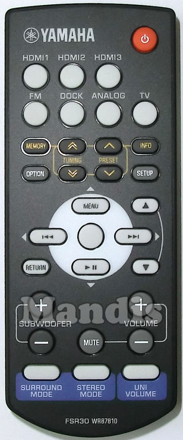 Power, HDMI 1, HDMI 2, HDMI 3, FM, Dock, Analog, TV, Memory, Option, Tuning +, Tuning -, Preset +, Preset -, Info, Setup, ^, v, Up / Menu, Down / Play / Pause, Right / >>I, Left / I<<, OK, Return, Subwoofer +, Subwoofer -, Mute, Volume +, Volume -, Surround Mode, Stereo Mode, Uni Volume