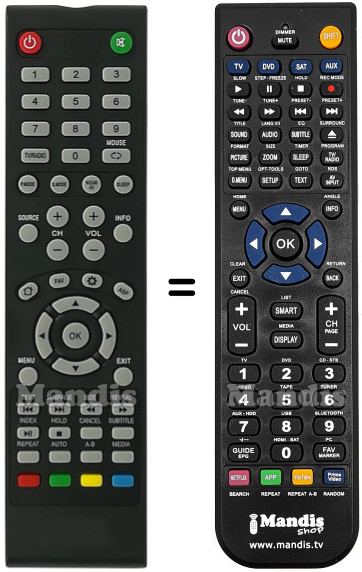 Abaixo, mostraremos a correspondência entre cada botão no controle remoto original e o botão que executa a mesma função no controle remoto de substituição. Em alguns casos, pode ser necessário pressionar a tecla SHIFT antes de pressionar outro botão para realizar determinadas ações. Essas funções adicionais geralmente não são amplamente utilizadas e são incluídas para facilitar o entendimento do controle remoto de substituição, ou porque o controle remoto original tem mais botões do que seu equivalente.