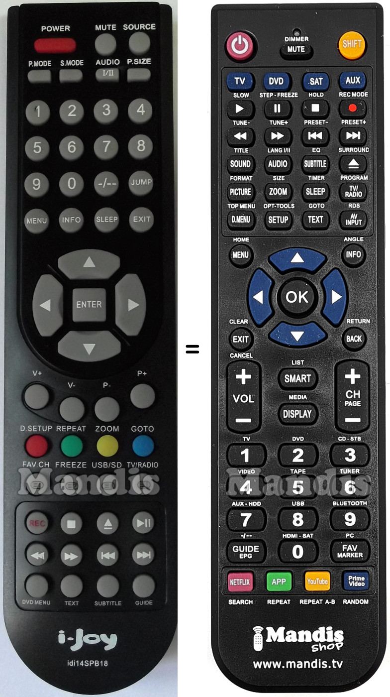 Abaixo, mostraremos a correspondência entre cada botão no controle remoto original e o botão que executa a mesma função no controle remoto de substituição. Em alguns casos, pode ser necessário pressionar a tecla SHIFT antes de pressionar outro botão para realizar determinadas ações. Essas funções adicionais geralmente não são amplamente utilizadas e são incluídas para facilitar o entendimento do controle remoto de substituição, ou porque o controle remoto original tem mais botões do que seu equivalente.